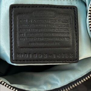 This is a beautiful bag from coach. It’s got the coach signature on the canvas on exterior. Has two straps both are leather. crossbody strap is detachable. Silver tone hardware. Front exterior has a pocket with a magnetic snap closure. Very minimal scratches on the hardware on this pocket. Top zipper closure. Interior is a light blue satin with one zip pocket and two slip pockets. There are some ink marks on the pocket with the zip opening see pictures. This bag is in excellent condition. Bottom corners look great. 12 1/2 inch width by 12 inch height. Crossbody strap drop is 13 inches. Very beautiful bag. From a smoke and pet free home except on my cute little grand dog comes to visit. Check out my five star ratings. Thank you for your interest in buying sustainably and helping out on our beautiful 🌎.