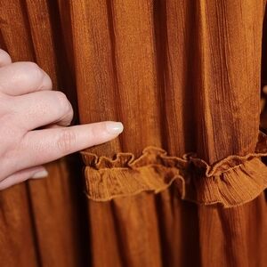 Chic long sleeve dress with ruffle details. Flowy and elegant design. Perfect for any occasion. It has a couple of places where food dropped on it that is pictured, but they are hardly noticeable. I also didn’t treat the stains. The dress is a beautiful rust color.