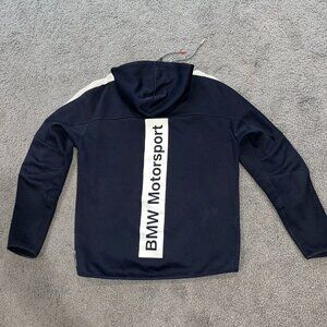 This is a Puma BMW M Motorsport T7 hooded sweat jacket. It is made as part of the collaboration between the sports brand Puma and the German carmaker's racing division, BMW M Motorsport.
