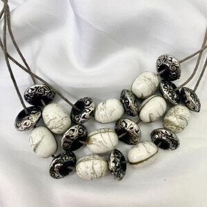 Boho Fairy Multi Strand Black White Silver Marbled Beaded Layered Necklace