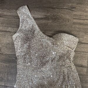 Shine in this stunning gold sequin one-shoulder dress. Perfect for special occasions, this dress offers a glamorous and sophisticated look.