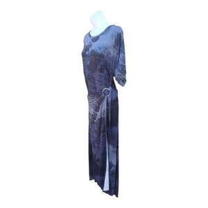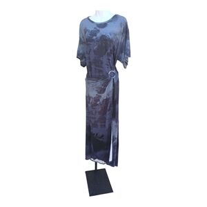 This drapey, long-sleeve dress features an exaggerated front slit and ring detailing. in a gorgeous blue, gray, and black wash.
