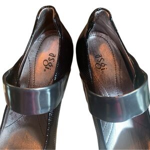 Asagi π Party Pumps. Mary Janes with retro contrasting pewter straps. The hook & loop closure provides for adjustment. Statement shoe with comfort bounce insole (patent pending). Flattering squared toe and textured sole. Dance the night away. Perfect for cocktail parties, formals, weddings, or vintage and Y2K-inspired looks. Glossy dot pattern patent leather. Tapered Key Hole Heels 2-3/4β. Black. Size 6.5.