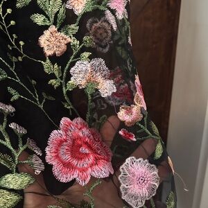 Chic black maxi dress. Features pink floral patterns. Ideal for elegant occasions, prom, wedding guest! The straps were tailored and fitted to someone with size 36A cups. Ideal for small chested women with wider hips!