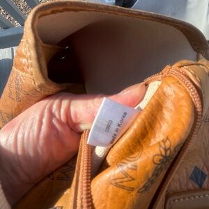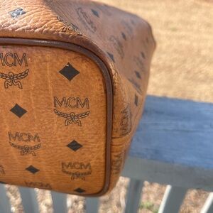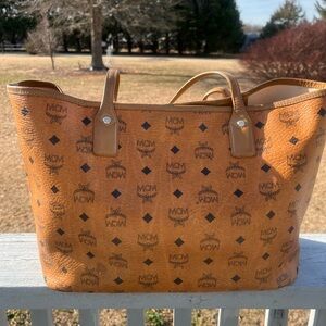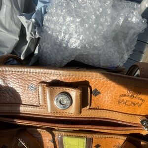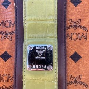MCM Visetos Croc-embossed Green Central Stripe Shoulder Bag Tote. Inside zip and slip pockets silver hardware magnetic snap closure some stains inside hardware has few scratches