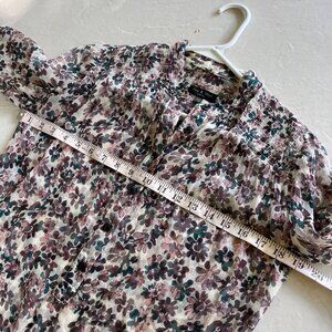 Romantic floral blouse crafted in sheer silk with shirred shoulders and ruffled cuffs.