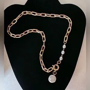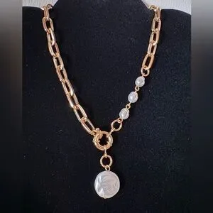 Elegant Gold Tone Chunky Chain and Faux Pearl Coin Drop Necklace 18”