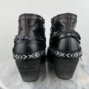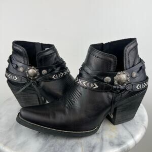 Durango Women's Crush by Durango Silver Accessory Belts Western Bootie. Originally labeled a size 6.5 and fits true to size. High quality and in good used condition, only worn a few times- a few light marks/scuffs from wear. Black genuine leather exterior with silver accent accessory belts. Interior zipper closure. Just over a 2.5" heel. Perfect statement bootie. Snip toe.