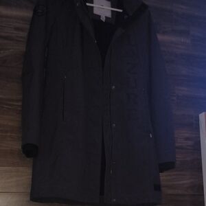 Stylish and warm ski jacket. Features a sleek design with a hood. Ideal for winter sports.
