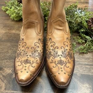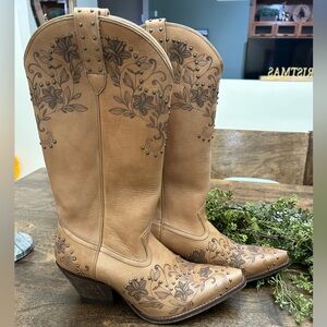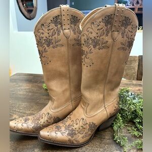Elegant brown boots with floral embroidery. Stylish and versatile for any occasion.