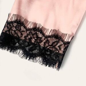 Indulge in luxury with this elegant pink and black lace sleepwear set. Perfect for a comfortable and stylish night in.