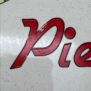 Interpur International decorative pie plate with cherry pie recipe printed on the dish. Features red and cream colors. Plate interior width is about 9 3/4". Exterior size is 10 3/4" × 4 1/2". It is in good condition with minor chip as photographed.