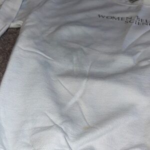 Embrace comfort and style with this white crewneck sweater featuring a bold science message. Perfect for casual outings.