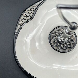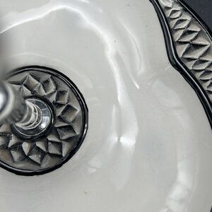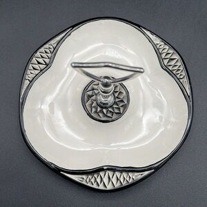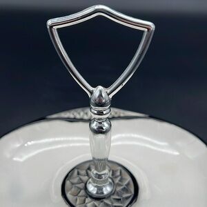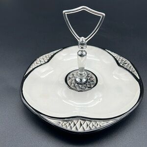 This has a nice retro pattern of diamonds outlined in black as well as in the center. It has a silver stem handle in the middle of dish.