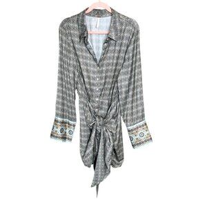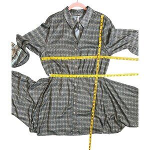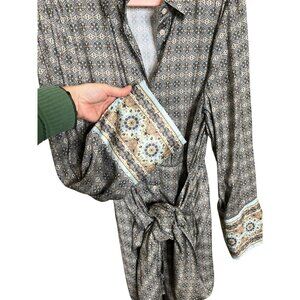 Free People dress, shirt dress, Silky Rillo dress, Free People print dress, boho shirt dress, button front dress, long sleeve dress, XL Free People, geometric print dress, tunic dress, boho neutral dress, Poshmark Free People