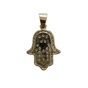 Elegant gold over sterling silver Hamsa hand pendant necklace adorned with sparkling moissanite stones. This is a Hamsa pendant, a hand-shaped amulet believed to provide protection and good luck. Perfect for adding a touch of luxury to any outfit.