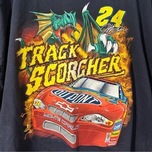 Bold graphic tee with Jeff Gordon’s #24 DuPont race car and dragon design. Features vibrant colors and dynamic imagery. Perfect for racing fans.