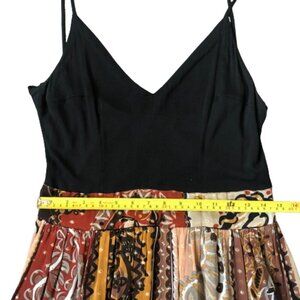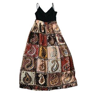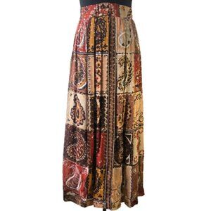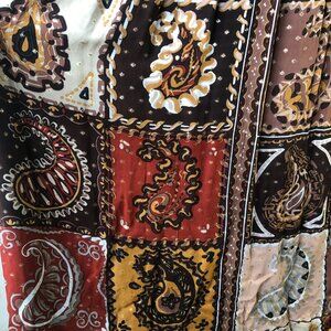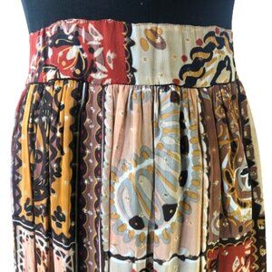 The skirt is more A line with a paisley print and in fall colors. Little metallic polka dots on gold are also included