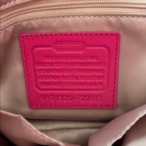 This coach bag is such a pretty color. The leather is soft and supple. It has two leather top handles. They’re in excellent condition. Silvertone hardware. Stud detail which adds cuteness to the bag. Front has subtle pleating detail, which is very feminine and looks great. Back exterior has a pocket. Top zip closure. Interior is is a taupe colour with a zip pocket and two slip pockets. Interior is in excellent condition except for teeny ink marks.See pics. They’re in bottom of bag so hard to see.There is some dark spots on bottom see pictures with minimal wear on leather bottom see pictures. Also small mark on side of bag- see pic.Check out my five star ratings. From a smoke and pet free home except when my cute little grand dog comes for a visit. Thank you for your interest in buying sustainably and helping out our beautiful 🌎