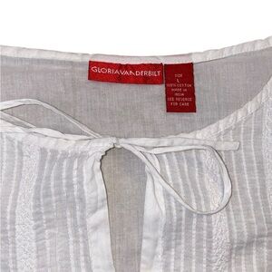 Timeless and airy white blouse by Gloria Vanderbilt, featuring pintuck detailing on the front and a delicate keyhole neckline with tie closure.