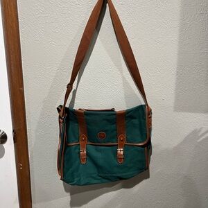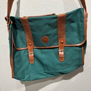 Stylish green canvas messenger bag featuring durable brown leather accents. Perfect for everyday use. One minor flaw shown on last pic the inside is pristine.