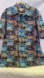 Vibrant Kahala Hawaiian shirt. Blue, brown, black& tan ukulele & music note pattern.