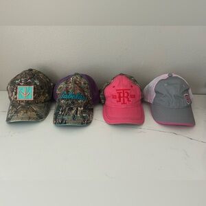 A bundle of 4 womens sized camo/hunting branded hats. The first is a turkey print, the second is cabelas branded, the third is realtree pink and camo, and the fourth is grey and pink mossy oak branded. No tags, never worn. Please let me know if you have any other questions!