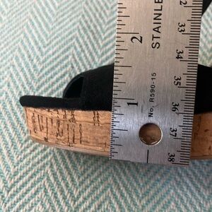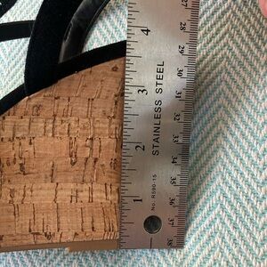 Very good used condition, lightly padded footbed. Upper feels like suede. Perfect for parties, weddings, etc lovely cork wedge platform. AI description: Step into elegance with these Charles By Charles David wedges, featuring a chic black suede strap and a natural cork wedge. The ankle strap design ensures a secure fit, while the medium-height wedge offers both style and comfort. Perfect for any occasion, these wedges effortlessly blend sophistication with versatility.