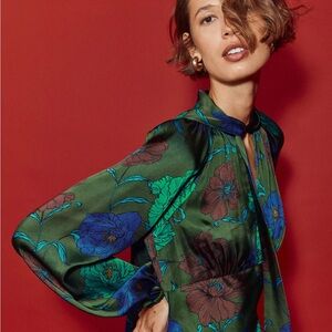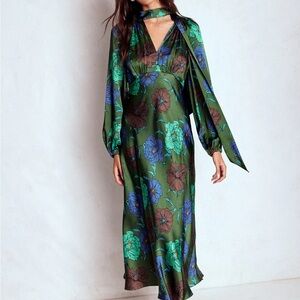 Chic green midi dress with vibrant floral design. Features a stylish bow detail. Perfect for any occasion. The quickest route to best-dressed guest status is our tie neck satin dress. The full sleeves and figure-skimming fit are made to flatter. The bloom-inspired print will see you reel in compliments. less