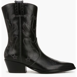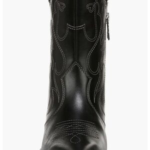 Stylish black heeled boots with intricate stitching. Perfect for a chic look.
