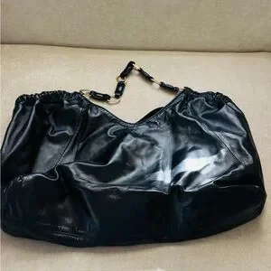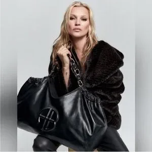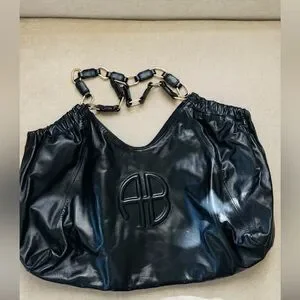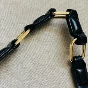 The Kate Tote is constructed from thin, slightly crinkled 100% Nappa leather. This iconic handbag features straps made of interlocked signature links in gold-tone hardware. Its oversized, carryall construction features a magnetic snap closure and elastic ruched side openings to reveal a large compartment with a single slip pocket and large zipper pocket. Finished with an embossed ANINE BING monogram at the front.