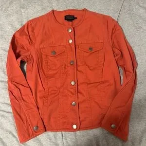 Stylish orange jacket with button-up front. Features two chest pockets. Perfect for casual wear. Size S petite