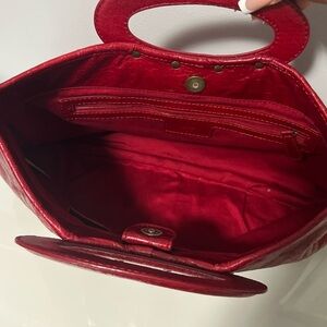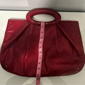 Elegant red leather hobo bag. Features a stylish circular handle. Ideal for any occasion.