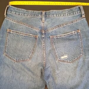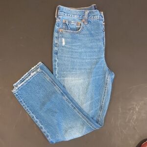 Stylish light blue jeans. Straight fit for everyday wear. Durable and versatile. Slightly distressed look, with a button fly. Inseam is about 25 inches, rise is about 10 inches.