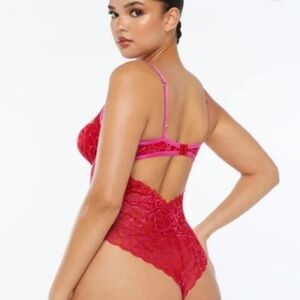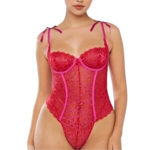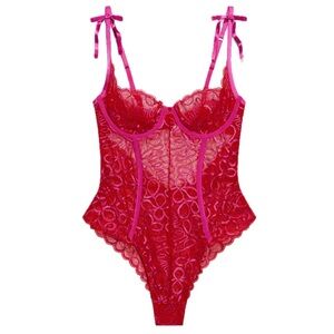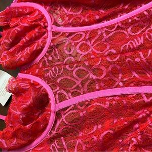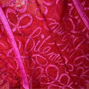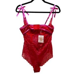 Savage X Fenty Ribbon Writing Lace Teddy Bodysuit Red and Pink Lace