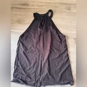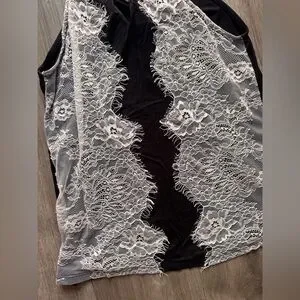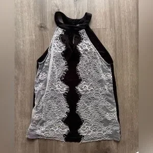 Elegant black halter top with white lace overlay. Perfect for a chic look. Super cute!