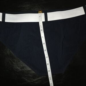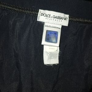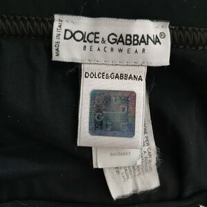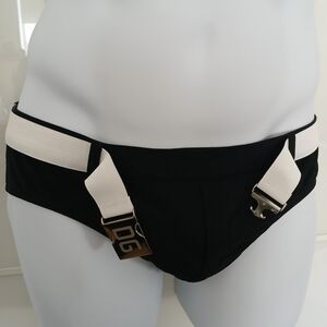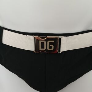 Stylish black swim briefs featuring a white waistband and DG logo buckle. Perfect for a sleek beach look.