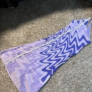 Beautiful shades. Good condition, but one hanger strap that you use to hang the dress so it does not stretch out is holding on by a thread. The other straps for the dress are in great condition. One strap has a pearlesque beading design that buttons a unique way. The dress is Stretchy and a size 10. Measurements are approximate. It seems to run small, but there is stretch so before purchasing please make sure to look at the approximate measurements.
