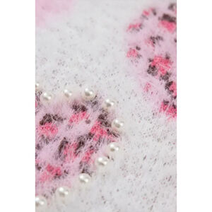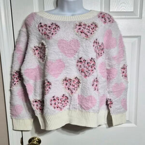 Cozy up in this charming pink leopard and white sweater featuring a delightful heart pattern with pearl outlining some of the hearts. Super soft fabric, feels just as soft on the inside of sweater as it does on the outside. Hearts and pearls vary in size, shape and spacing. Perfect for adding a touch of warmth and style to your wardrobe. Perfect for Valentines or romantic outings or just showing your love this winter. NWOT
