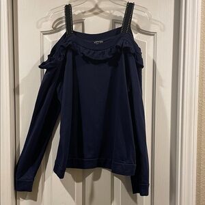 Stylish navy cold shoulder top with ruffle details and embellished straps by Venus.