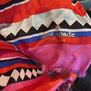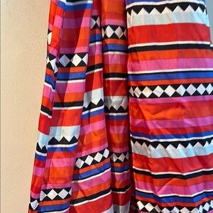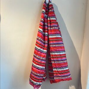 Bright and colorful scarf with bold stripes. Features a mix of red, pink, and black patterns.