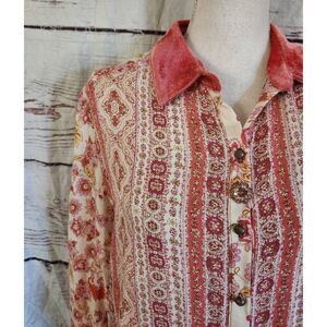 Multicolor flowy long sleeve tunic with velvet collar, decorative button closure, print throughout with contrasting back panel. In great condition.