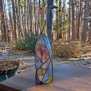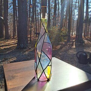 Add a unique, colorful touch to any room with this upcycled, hand-painted wine bottle. The design features a faux stained glass pattern in vibrant blue, yellow, pink, and purple tones, outlined with black "leading" lines. This piece works as a beautiful decorative accent with the lights off, and a charming warm lamp when lit.