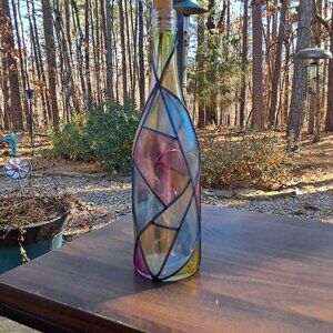 Hand Painted Faux Stained Glass Wine Bottle Lamp w/Fairy Lights-Unique Decor