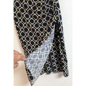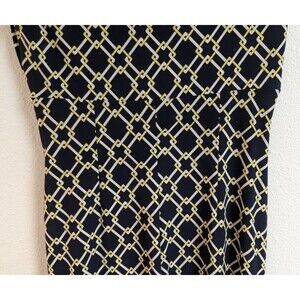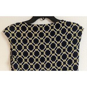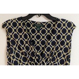 Elevate your wardrobe with this stunning Lauren Ralph Lauren dress. The sleeveless wrap dress features a geometric pattern in navy blue, white, and yellow, making it perfect for any occasion, be it a wedding, party, or business event. The dress is made of a comfortable and stretchy jersey fabric that is machine washable, ensuring easy maintenance.