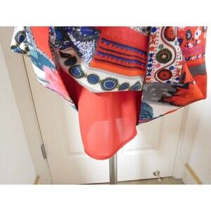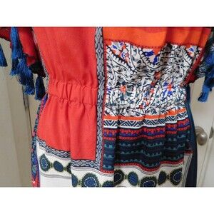 This stunning Anthropologie Vanessa Virginia dress is perfect for any occasion. The beautiful floral pattern and red color make it a standout piece. The dress features short flutter sleeves with tassels, a round neckline, and a pullover closure. Its blouson style and knee-length cut create a flattering silhouette that is suitable for summer, fall, and spring.