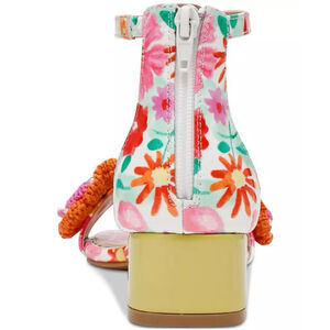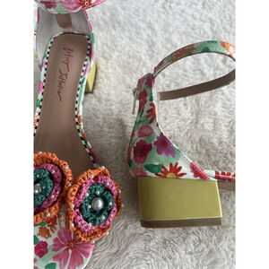 Bright hand-crafted macrame blooms and lustrous imitation pearls pop from the comfortable low-heeled silhouette of the Brandee sandals from Betsey Johnson.