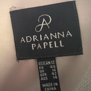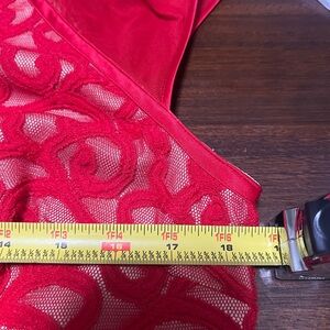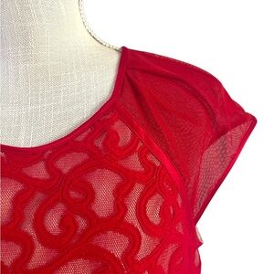 This striking red sheath dress by Adrianna Papell features a sophisticated crew neck and elegant cap dolman sleeves. The intricate lace overlay with a tan lining adds a touch of romance, making it perfect for a cocktail night out.