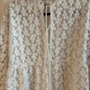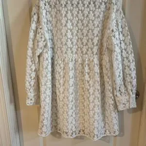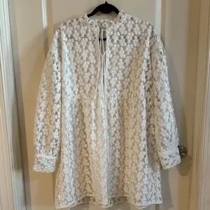 This romantic babydoll mini or tunic is sure to be a showstopper wherever you go. It features a ruffled high collar, front tie closure, long sleeves, and a semi-sheer material with a textured floral pattern. Fully lined. 33 inches from shoulder to hem. Perfect for romantic, stylish, casual outings. Pair with your favorite sandals, boots, or sneakers and stand out in the crowd. Excellent, like new condition. Thanks for stopping by!! Please make me an offer I can’t refuse!!