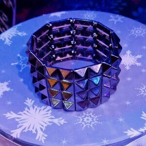 A real stunner with fabulous style and extremely comfortable to wear. This bracelet screams, "I'm edgy but also like shiny things!" A stretchy accessory that fits most wrists and gives your outfit that retro rock star vibe. Stored well and worn once. Non-smoking home. (Statement, Retro, Vintage, Classic, Fashion, Bracelet, Bling, Glam, Silver, Wide, Textured, Chunky, Punk, Goth...Rock 'N' Roll)